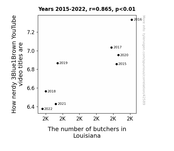 This means 74.7% of the change in the one variable (i.e., The number of butchers in Louisiana) is predictable based on the change in the other (i.e., How nerdy 3Blue1Brown YouTube video titles are) over the 8 years from 2015 through 2022.