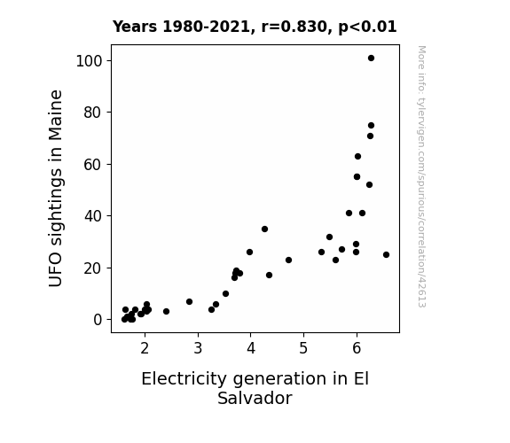 This means 68.8% of the change in the one variable (i.e., Electricity generation in El Salvador) is predictable based on the change in the other (i.e., UFO sightings in Maine) over the 42 years from 1980 through 2021.