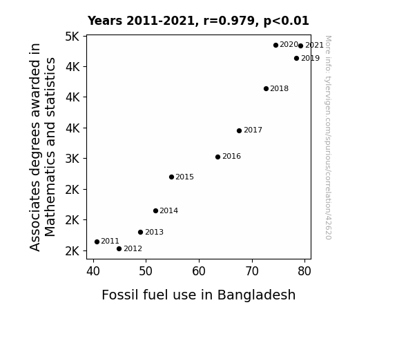 This means 95.9% of the change in the one variable (i.e., Fossil fuel use in Bangladesh) is predictable based on the change in the other (i.e., Associates degrees awarded in Mathematics and statistics) over the 11 years from 2011 through 2021.
