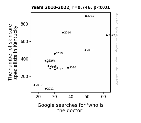 This means 55.6% of the change in the one variable (i.e., Google searches for 'who is the doctor') is predictable based on the change in the other (i.e., The number of skincare specialists in Kentucky) over the 13 years from 2010 through 2022.