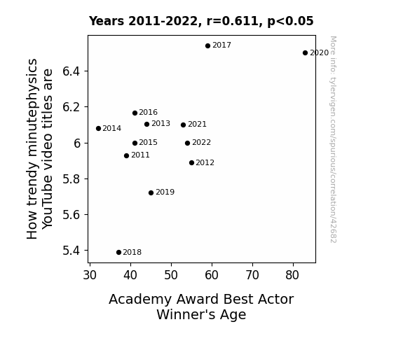This means 37.4% of the change in the one variable (i.e., Academy Award Best Actor Winner's Age) is predictable based on the change in the other (i.e., How trendy minutephysics YouTube video titles are) over the 12 years from 2011 through 2022.