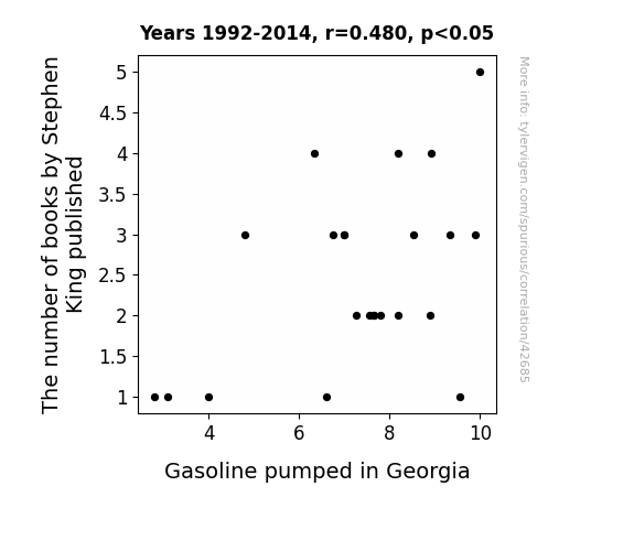 This means 23.1% of the change in the one variable (i.e., Gasoline pumped in Georgia) is predictable based on the change in the other (i.e., The number of books by Stephen King published) over the 23 years from 1992 through 2014.