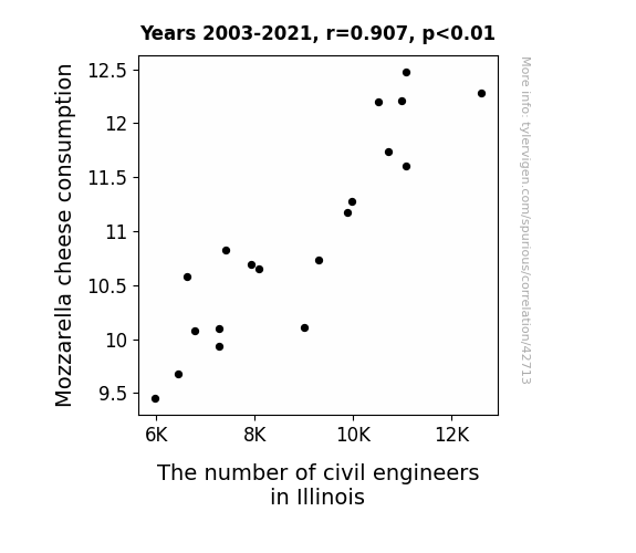 This means 82.3% of the change in the one variable (i.e., The number of civil engineers in Illinois) is predictable based on the change in the other (i.e., Mozzarella cheese consumption) over the 19 years from 2003 through 2021.