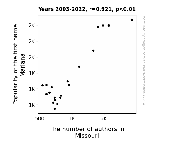 This means 84.8% of the change in the one variable (i.e., The number of authors in Missouri) is predictable based on the change in the other (i.e., Popularity of the first name Mariana) over the 20 years from 2003 through 2022.