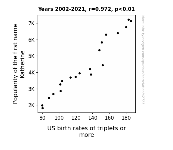This means 94.5% of the change in the one variable (i.e., US birth rates of triplets or more) is predictable based on the change in the other (i.e., Popularity of the first name Katherine) over the 20 years from 2002 through 2021.