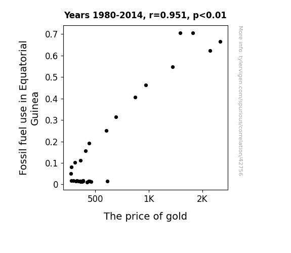 This means 90.4% of the change in the one variable (i.e., The price of gold) is predictable based on the change in the other (i.e., Fossil fuel use in Equatorial Guinea) over the 35 years from 1980 through 2014.