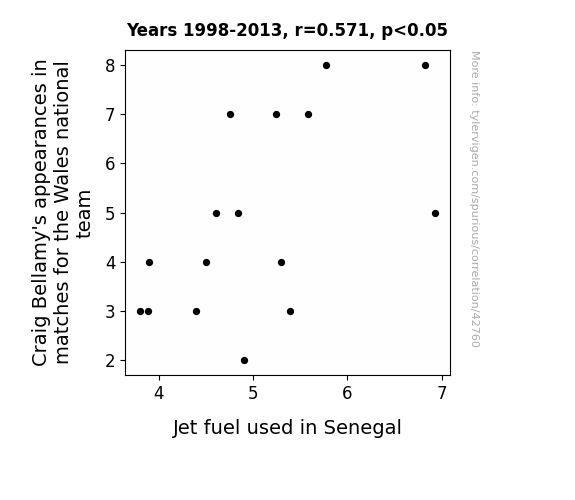 This means 32.6% of the change in the one variable (i.e., Jet fuel used in Senegal) is predictable based on the change in the other (i.e., Craig Bellamy's appearances in matches for the Wales national team) over the 16 years from 1998 through 2013.