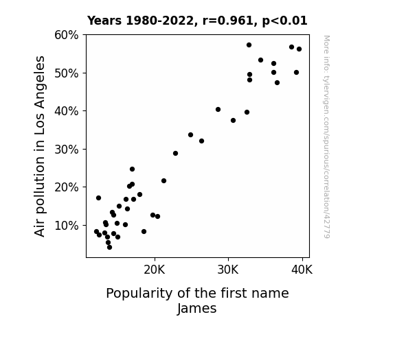 This means 92.4% of the change in the one variable (i.e., Popularity of the first name James) is predictable based on the change in the other (i.e., Air pollution in Los Angeles) over the 43 years from 1980 through 2022.