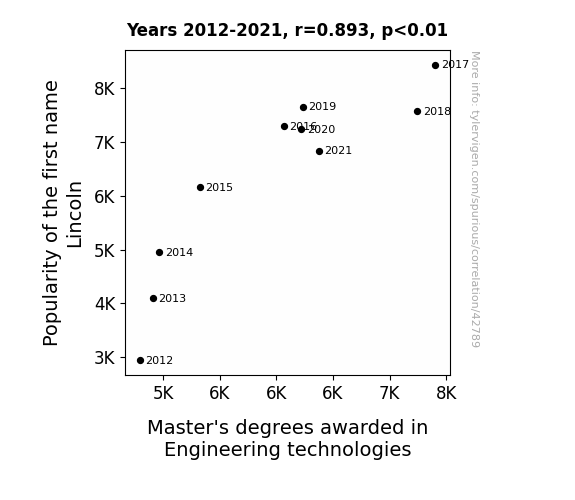 This means 79.7% of the change in the one variable (i.e., Master's degrees awarded in Engineering technologies) is predictable based on the change in the other (i.e., Popularity of the first name Lincoln) over the 10 years from 2012 through 2021.