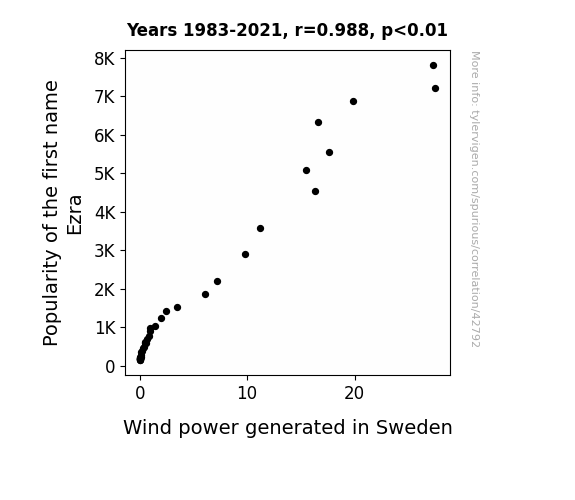 This means 97.6% of the change in the one variable (i.e., Wind power generated in Sweden) is predictable based on the change in the other (i.e., Popularity of the first name Ezra) over the 39 years from 1983 through 2021.