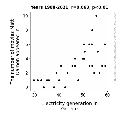 This means 44% of the change in the one variable (i.e., Electricity generation in Greece) is predictable based on the change in the other (i.e., The number of movies Matt Damon appeared in) over the 34 years from 1988 through 2021.