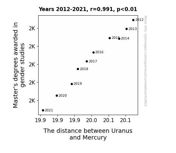 This means 98.1% of the change in the one variable (i.e., The distance between Uranus and Mercury) is predictable based on the change in the other (i.e., Master's degrees awarded in gender studies) over the 10 years from 2012 through 2021.