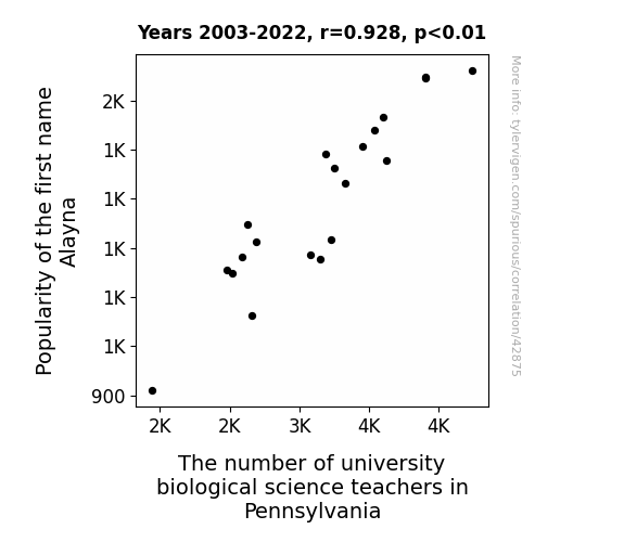 This means 86.1% of the change in the one variable (i.e., The number of university biological science teachers in Pennsylvania) is predictable based on the change in the other (i.e., Popularity of the first name Alayna) over the 20 years from 2003 through 2022.
