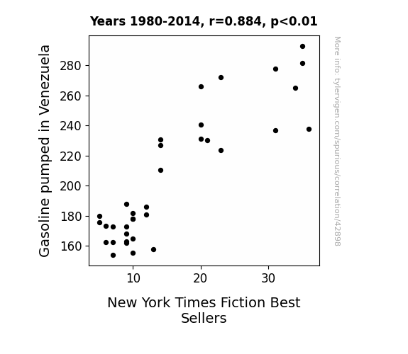 This means 78.2% of the change in the one variable (i.e., New York Times Fiction Best Sellers) is predictable based on the change in the other (i.e., Gasoline pumped in Venezuela) over the 35 years from 1980 through 2014.