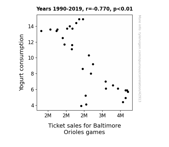 This means 59.2% of the change in the one variable (i.e., Ticket sales for Baltimore Orioles games) is predictable based on the change in the other (i.e., Yogurt consumption) over the 30 years from 1990 through 2019.