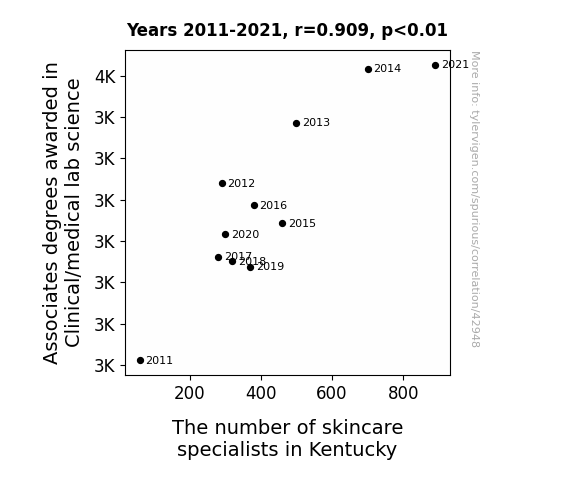 This means 82.6% of the change in the one variable (i.e., The number of skincare specialists in Kentucky) is predictable based on the change in the other (i.e., Associates degrees awarded in Clinical/medical lab science) over the 11 years from 2011 through 2021.