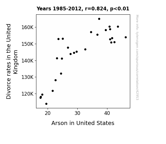 This means 67.9% of the change in the one variable (i.e., Arson in United States) is predictable based on the change in the other (i.e., Divorce rates in the United Kingdom) over the 28 years from 1985 through 2012.