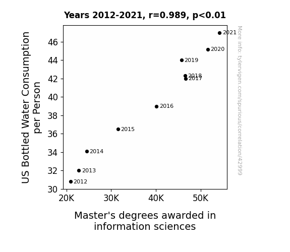 This means 97.8% of the change in the one variable (i.e., Master's degrees awarded in information sciences) is predictable based on the change in the other (i.e., US Bottled Water Consumption per Person) over the 10 years from 2012 through 2021.