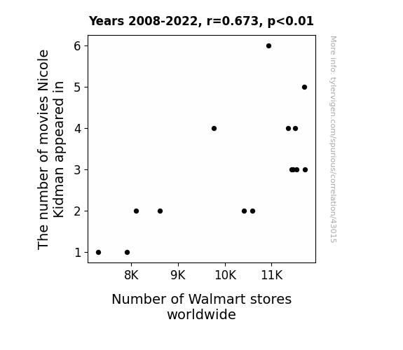 This means 45.3% of the change in the one variable (i.e., Number of Walmart stores worldwide) is predictable based on the change in the other (i.e., The number of movies Nicole Kidman appeared in) over the 15 years from 2008 through 2022.