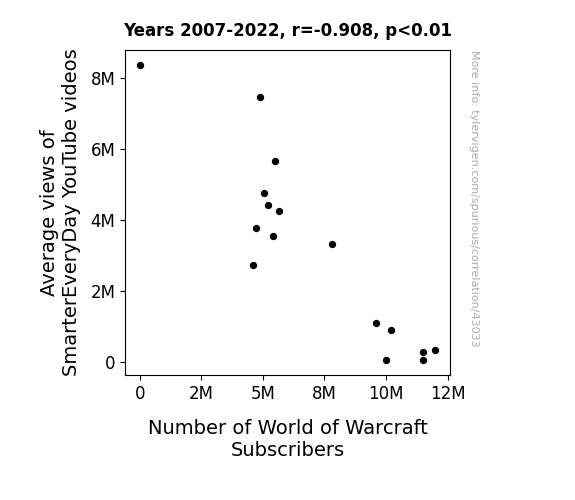 This means 82.5% of the change in the one variable (i.e., Number of World of Warcraft Subscribers) is predictable based on the change in the other (i.e., Average views of SmarterEveryDay YouTube videos) over the 16 years from 2007 through 2022.