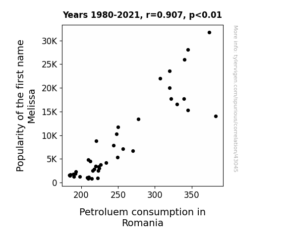 This means 82.3% of the change in the one variable (i.e., Petroluem consumption in Romania) is predictable based on the change in the other (i.e., Popularity of the first name Melissa) over the 42 years from 1980 through 2021.