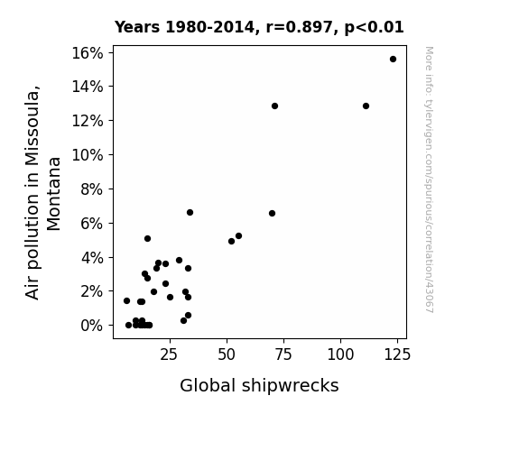 This means 80.4% of the change in the one variable (i.e., Global shipwrecks ) is predictable based on the change in the other (i.e., Air pollution in Missoula, Montana) over the 35 years from 1980 through 2014.