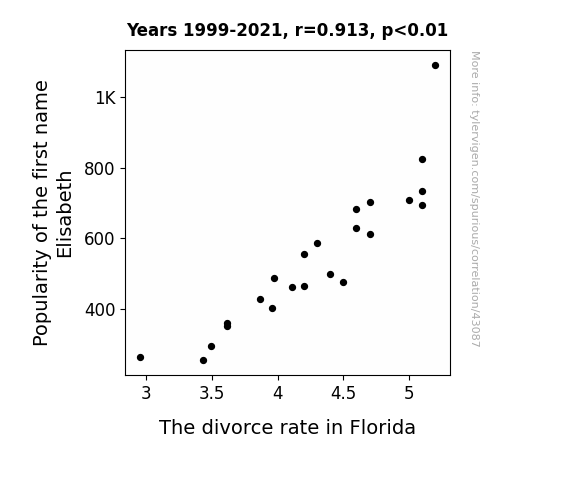 This means 83.4% of the change in the one variable (i.e., The divorce rate in Florida) is predictable based on the change in the other (i.e., Popularity of the first name Elisabeth) over the 23 years from 1999 through 2021.