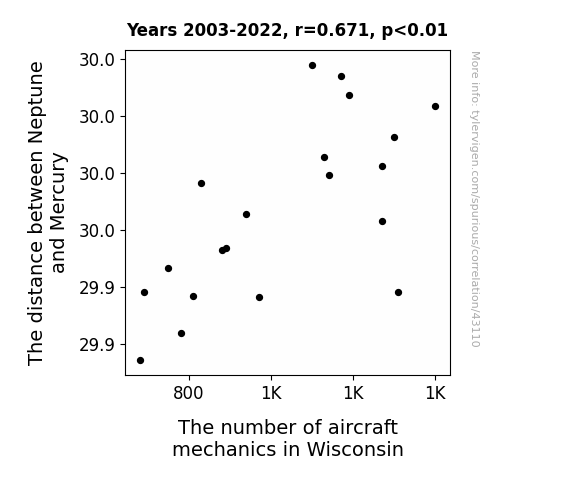 This means 45% of the change in the one variable (i.e., The number of aircraft mechanics in Wisconsin) is predictable based on the change in the other (i.e., The distance between Neptune and Mercury) over the 20 years from 2003 through 2022.
