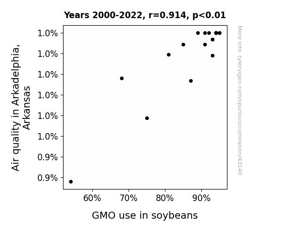 This means 83.5% of the change in the one variable (i.e., GMO use in soybeans) is predictable based on the change in the other (i.e., Air quality in Arkadelphia, Arkansas) over the 23 years from 2000 through 2022.