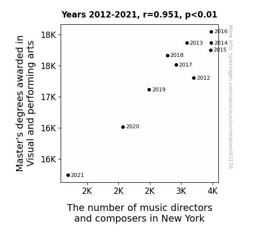 This means 90.4% of the change in the one variable (i.e., The number of music directors and composers in New York) is predictable based on the change in the other (i.e., Master's degrees awarded in Visual and performing arts) over the 10 years from 2012 through 2021.