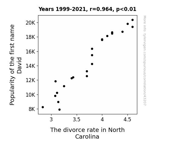 This means 92.9% of the change in the one variable (i.e., The divorce rate in North Carolina) is predictable based on the change in the other (i.e., Popularity of the first name David) over the 23 years from 1999 through 2021.