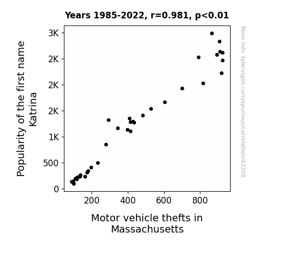 This means 96.2% of the change in the one variable (i.e., Motor vehicle thefts in Massachusetts) is predictable based on the change in the other (i.e., Popularity of the first name Katrina) over the 38 years from 1985 through 2022.