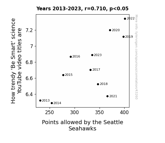 This means 50.4% of the change in the one variable (i.e., Points allowed by the Seattle Seahawks) is predictable based on the change in the other (i.e., How trendy 'Be Smart' science YouTube video titles are) over the 11 years from 2013 through 2023.