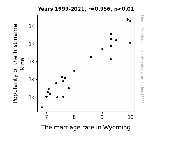This means 91.5% of the change in the one variable (i.e., The marriage rate in Wyoming) is predictable based on the change in the other (i.e., Popularity of the first name Nina) over the 23 years from 1999 through 2021.