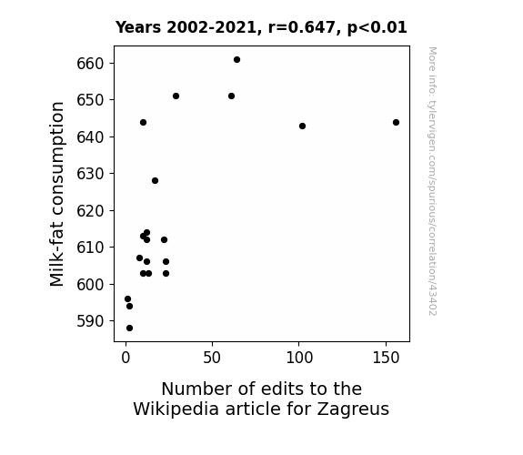 This means 41.9% of the change in the one variable (i.e., Number of edits to the Wikipedia article for Zagreus) is predictable based on the change in the other (i.e., Milk-fat consumption) over the 20 years from 2002 through 2021.