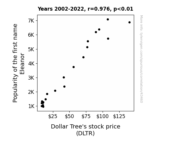 This means 95.3% of the change in the one variable (i.e., Dollar Tree's stock price (DLTR)) is predictable based on the change in the other (i.e., Popularity of the first name Eleanor) over the 21 years from 2002 through 2022.