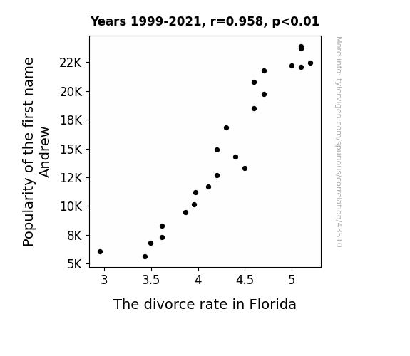 This means 91.8% of the change in the one variable (i.e., The divorce rate in Florida) is predictable based on the change in the other (i.e., Popularity of the first name Andrew) over the 23 years from 1999 through 2021.