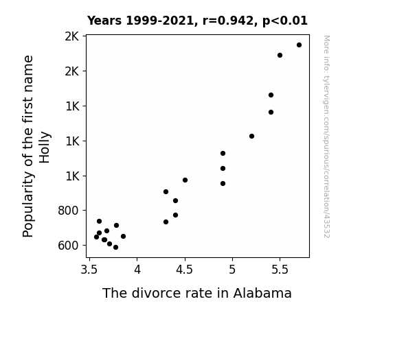 This means 88.8% of the change in the one variable (i.e., The divorce rate in Alabama) is predictable based on the change in the other (i.e., Popularity of the first name Holly) over the 23 years from 1999 through 2021.