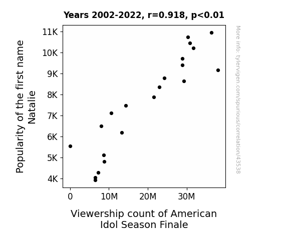 This means 84.3% of the change in the one variable (i.e., Viewership count of American Idol Season Finale) is predictable based on the change in the other (i.e., Popularity of the first name Natalie) over the 21 years from 2002 through 2022.
