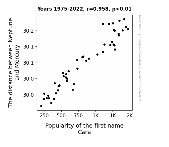 This means 91.7% of the change in the one variable (i.e., Popularity of the first name Cara) is predictable based on the change in the other (i.e., The distance between Neptune and Mercury) over the 48 years from 1975 through 2022.