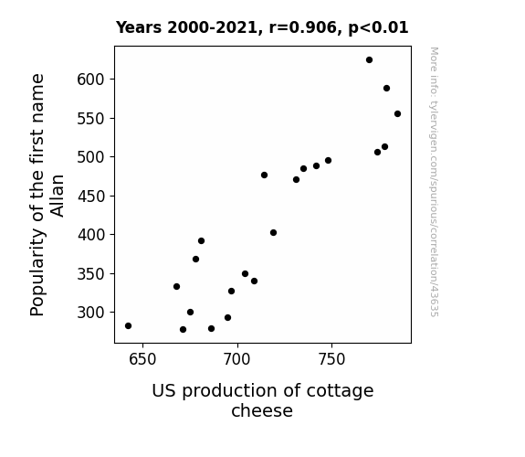 This means 82.2% of the change in the one variable (i.e., US production of cottage cheese) is predictable based on the change in the other (i.e., Popularity of the first name Allan) over the 22 years from 2000 through 2021.