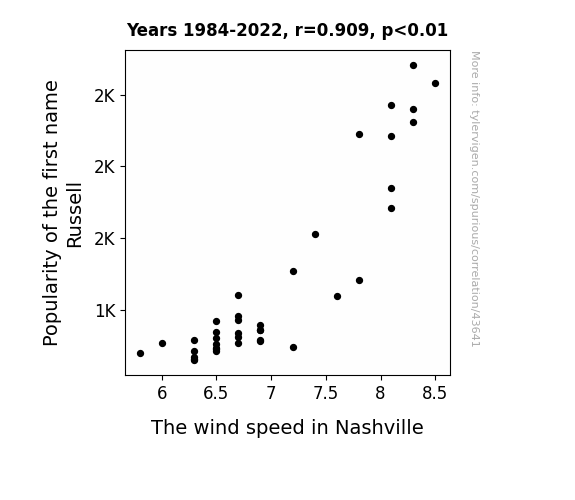 This means 82.6% of the change in the one variable (i.e., The wind speed in Nashville) is predictable based on the change in the other (i.e., Popularity of the first name Russell) over the 39 years from 1984 through 2022.