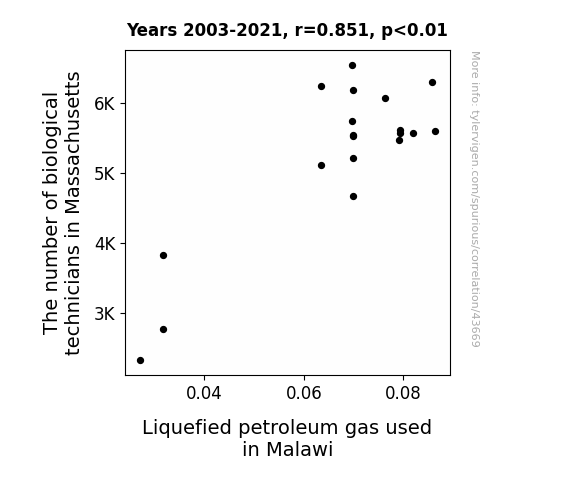 This means 72.5% of the change in the one variable (i.e., Liquefied petroleum gas used in Malawi) is predictable based on the change in the other (i.e., The number of biological technicians in Massachusetts) over the 19 years from 2003 through 2021.