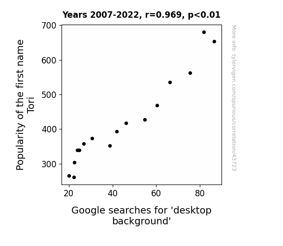 This means 93.9% of the change in the one variable (i.e., Google searches for 'desktop background') is predictable based on the change in the other (i.e., Popularity of the first name Tori) over the 16 years from 2007 through 2022.