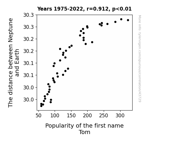 This means 83.1% of the change in the one variable (i.e., Popularity of the first name Tom) is predictable based on the change in the other (i.e., The distance between Neptune and Earth) over the 48 years from 1975 through 2022.