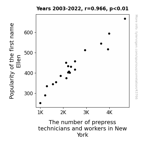 This means 93.3% of the change in the one variable (i.e., The number of prepress technicians and workers in New York) is predictable based on the change in the other (i.e., Popularity of the first name Ellen) over the 20 years from 2003 through 2022.