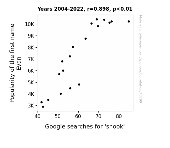This means 80.6% of the change in the one variable (i.e., Google searches for 'shook') is predictable based on the change in the other (i.e., Popularity of the first name Evan) over the 19 years from 2004 through 2022.