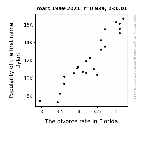 This means 88.3% of the change in the one variable (i.e., The divorce rate in Florida) is predictable based on the change in the other (i.e., Popularity of the first name Dylan) over the 23 years from 1999 through 2021.