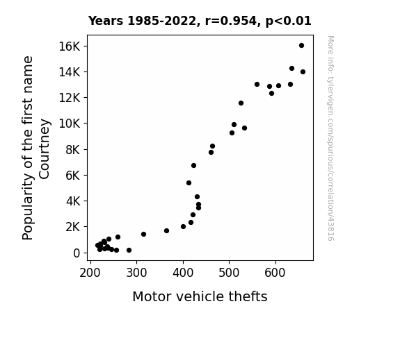 This means 91% of the change in the one variable (i.e., Motor vehicle thefts) is predictable based on the change in the other (i.e., Popularity of the first name Courtney) over the 38 years from 1985 through 2022.
