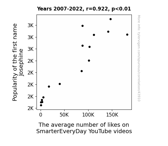 This means 85.1% of the change in the one variable (i.e., The average number of likes on SmarterEveryDay YouTube videos) is predictable based on the change in the other (i.e., Popularity of the first name Josephine) over the 16 years from 2007 through 2022.